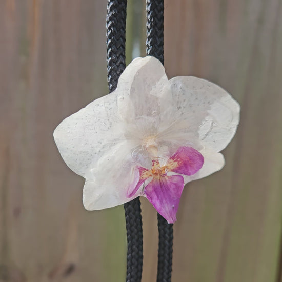 This bolo tie features a genuine dried orchid encased in resin, making it a unique statement piece.