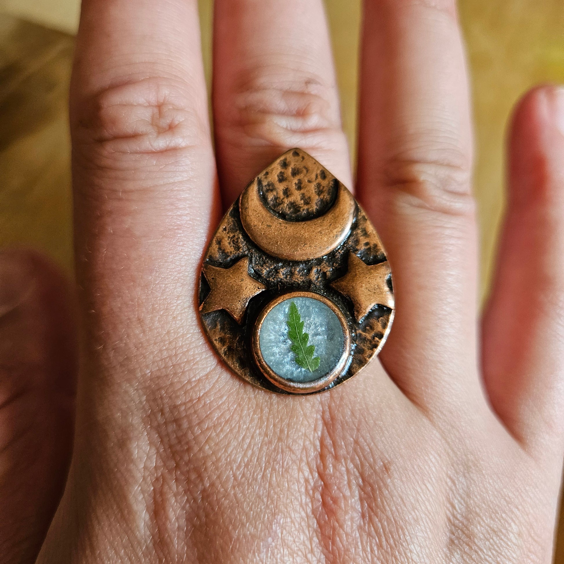 Celestial statement ring with pressed fern.
