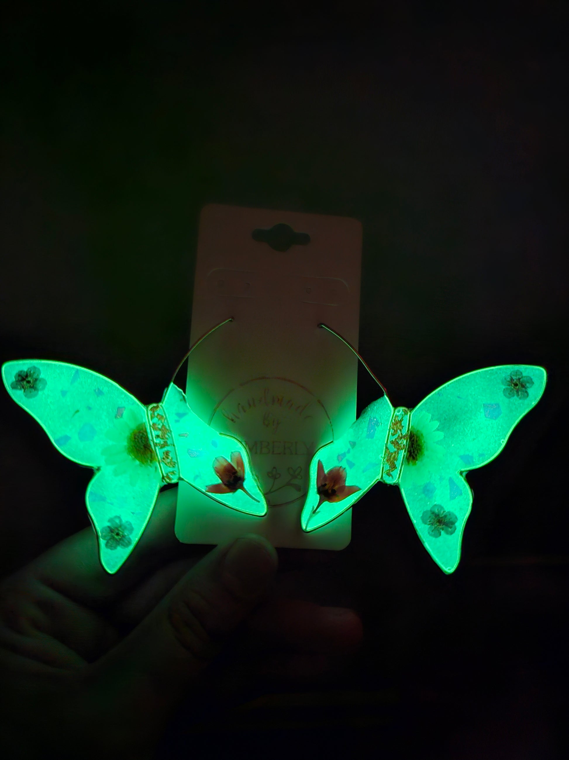 These Glow Butterfly Hoops shine bright both day and night! Crafted with gold wire and shimmering gold leaf/holographic sparkle, they showcase charming large and small daisies alongside delicate boronia. Wear these hoops for a playful pop of sparkle that lights up your evening.
