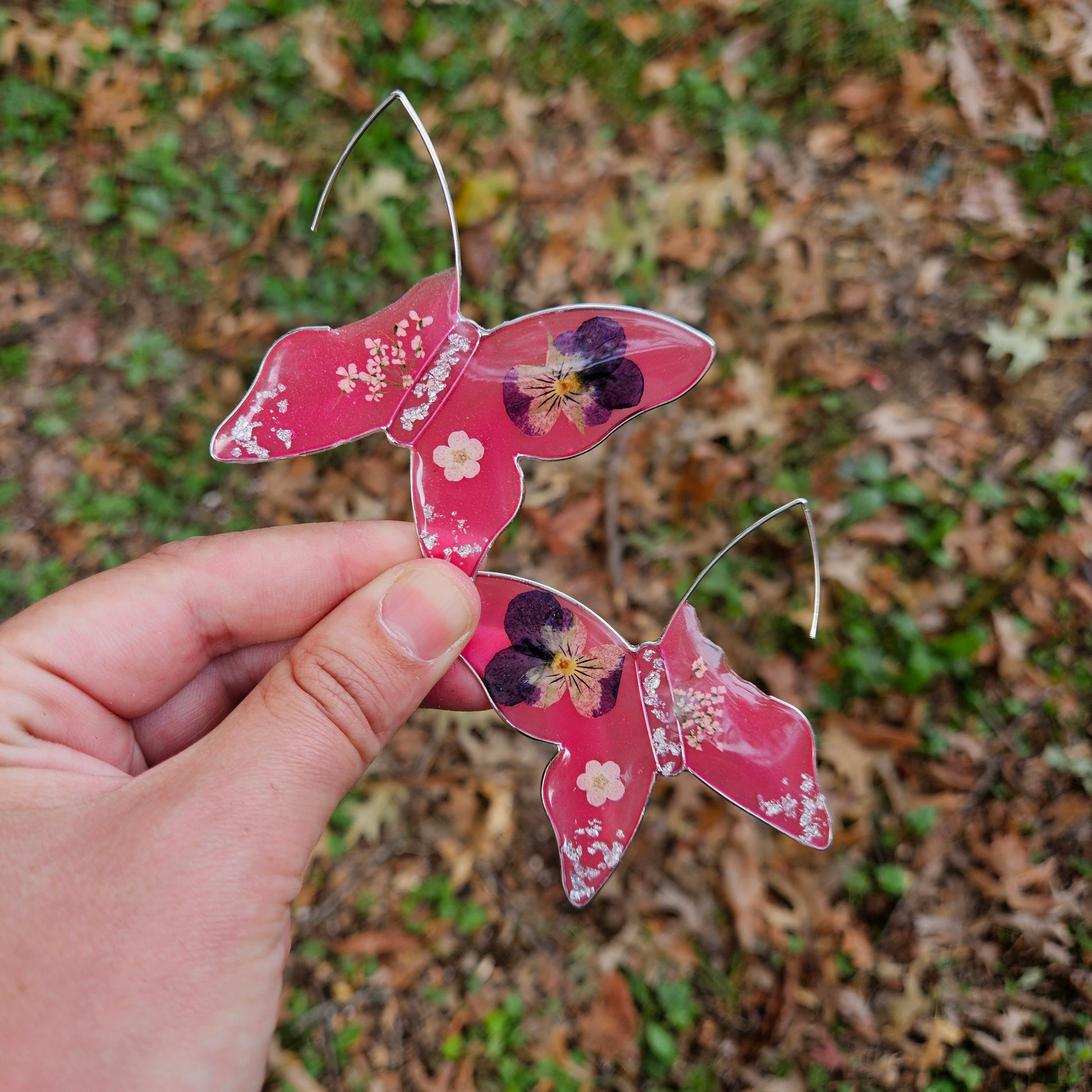 Delight in dazzling fuchsia and silver butterflies paired with silver leaf, pressed pansies, cherry blossoms, and queen anne's lace - charming by day, beautifully bright by night.
