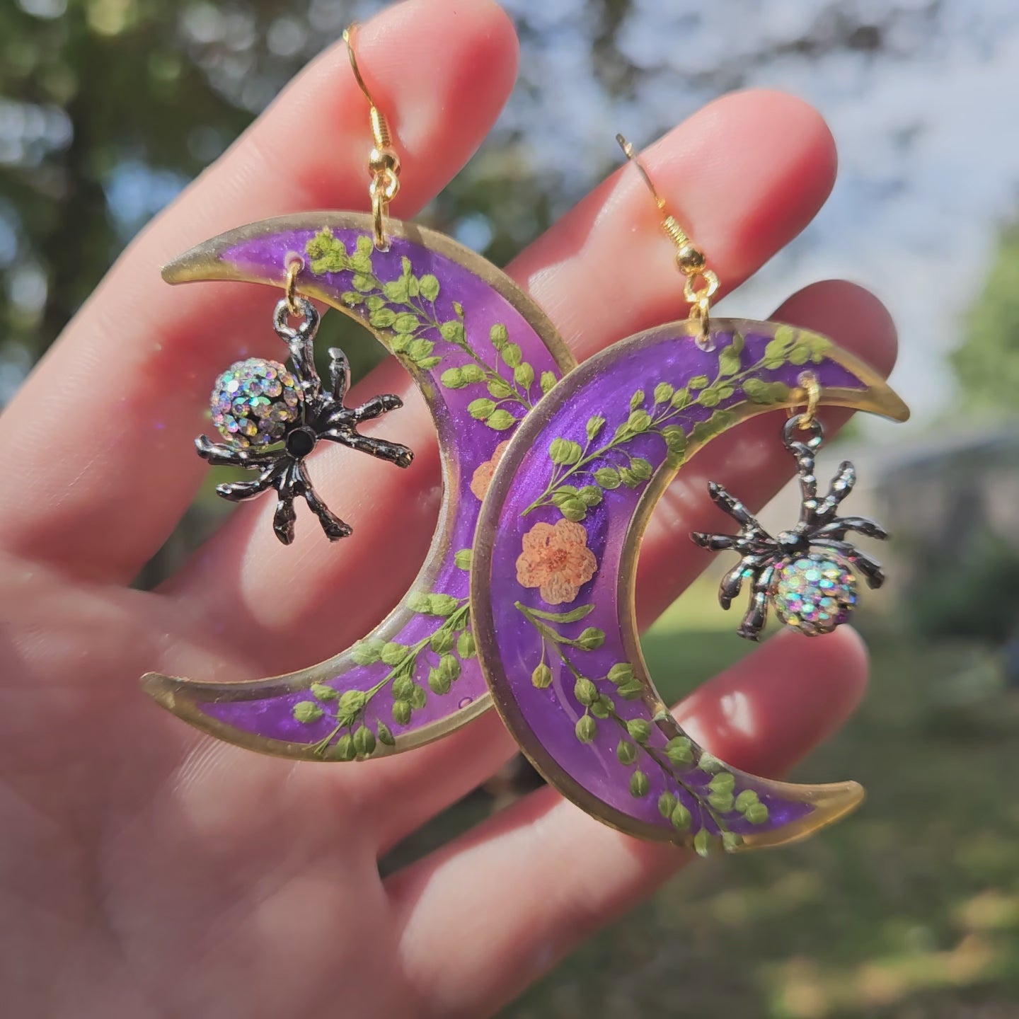 Sparkling garden spiders dangling from purple floral moons featuring pressed pepperweed and orange mini daisies.